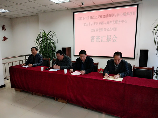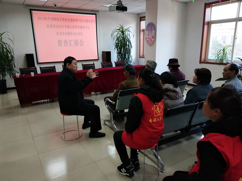 在召开的项目督查汇报会上,中心负责人鲍小兵对试点项目运营情况进行了详细的汇报。王振中同志在听取汇报后强调:我市能争取到居家养老服务试点项目,体现了党和政府对贫困地区居家养老事业的高度重视和大力支持,项目的实施将会有力推动全市居家养老事业的健康发展。希望定西市安定区幸福人家养老服务中心加强项目资金管理,组织得力人员把这一项目实施好,为居家养老做出有益探索,为老年人撑起一片希望的蓝天。