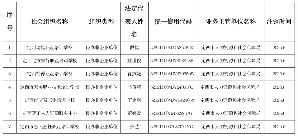 根据《社会团体登记管理条例》《民办非企业单位登记管理暂行条例》相关规定,定西市人力资源和社会保障局已对以下社会组织完成注销相关流程,请相关社会组织自本公告发布之日起30日内,通过民政一体化政务服务平台提交注销登记申请。若逾期未按规定申请办理注销登记,我局将依法予以撤销登记。
