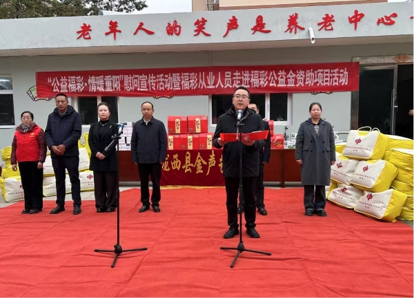 岁岁重阳,今又重阳。为弘扬中华民族尊老敬老的传统美德,助力“9·27”陇西5.6级地震灾后关怀,定西市福彩中心于10月28日组织开展了“公益福彩·情暖重阳”慰问宣传活动,走进陇西县社会福利服务中心和漳县老年养护院,为老人们送去节日的祝福与社会的温暖。 此次活动由定西市民政局主办,市福彩中心承办,部分福彩投注站业主及中心工作人员共同参与。市民政局党组成员、副局长王睿才出席活动并致辞。他指出,福利彩票公益金是汇聚社会爱心的“温暖纽带”,此次活动既是对福彩“扶老、助残、救孤、济困”发行宗旨的生动践行,也是帮助地震受灾地区老人安度重阳的具体举措。