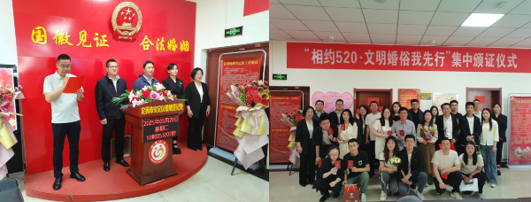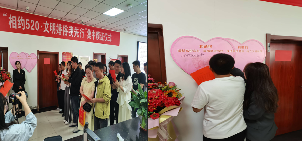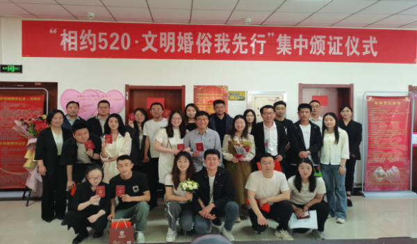 5月20日,值新修订的《婚姻登记条例》全面施行之际,由区委社工部、区文明实践办、区民政局、团区委、区妇联联合主办的“相约520·文明婚俗我先行”集中颁证仪式在区婚姻登记中心隆重举行。活动旨在以新政策落地为契机,倡导简约婚礼、抵制高价彩礼、弘扬婚俗新风,吸引20余对新人共同参与,以实际行动践行文明新风尚。